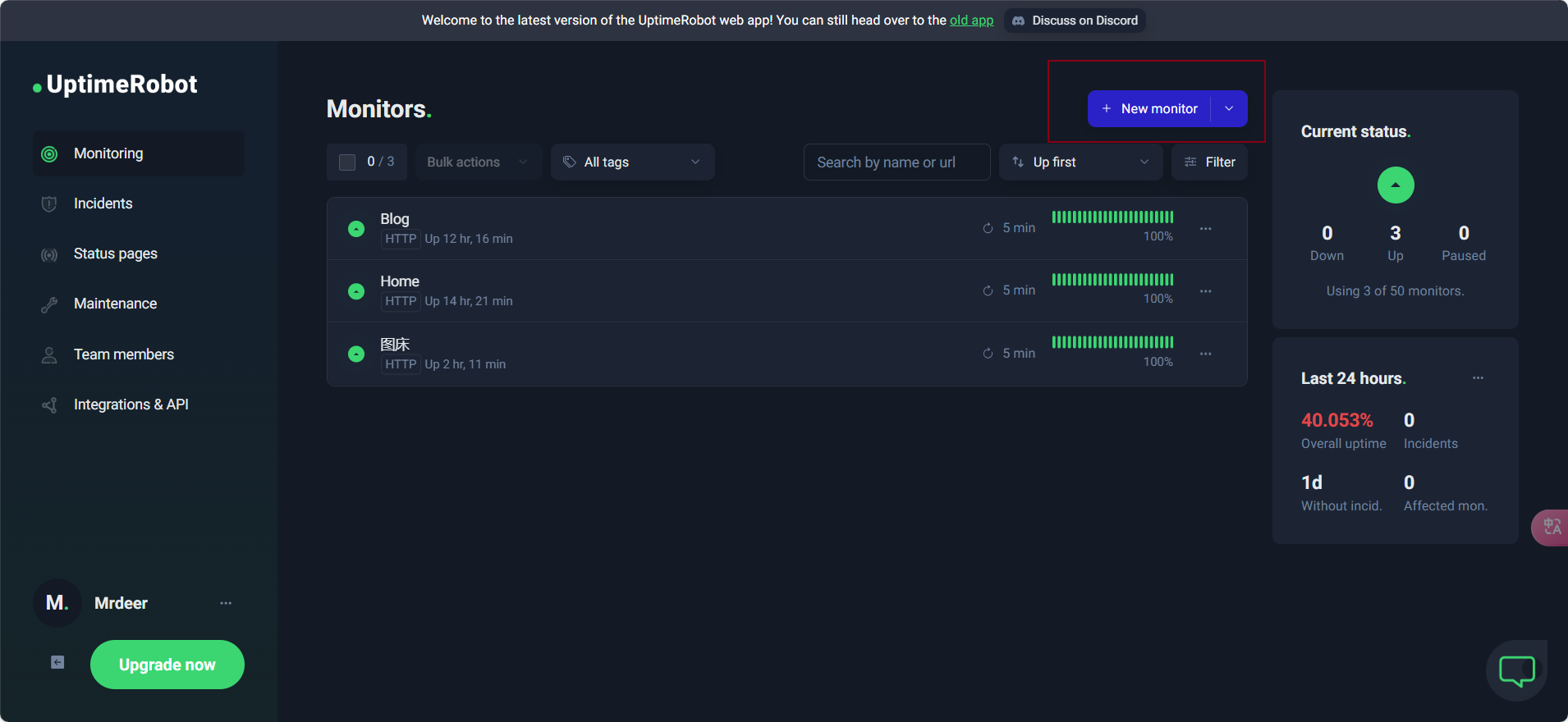 访问 UptimeRobot 官网,注册免费版账户。完成后登陆仪表盘,点击 “New monitor” 新建监测任务: