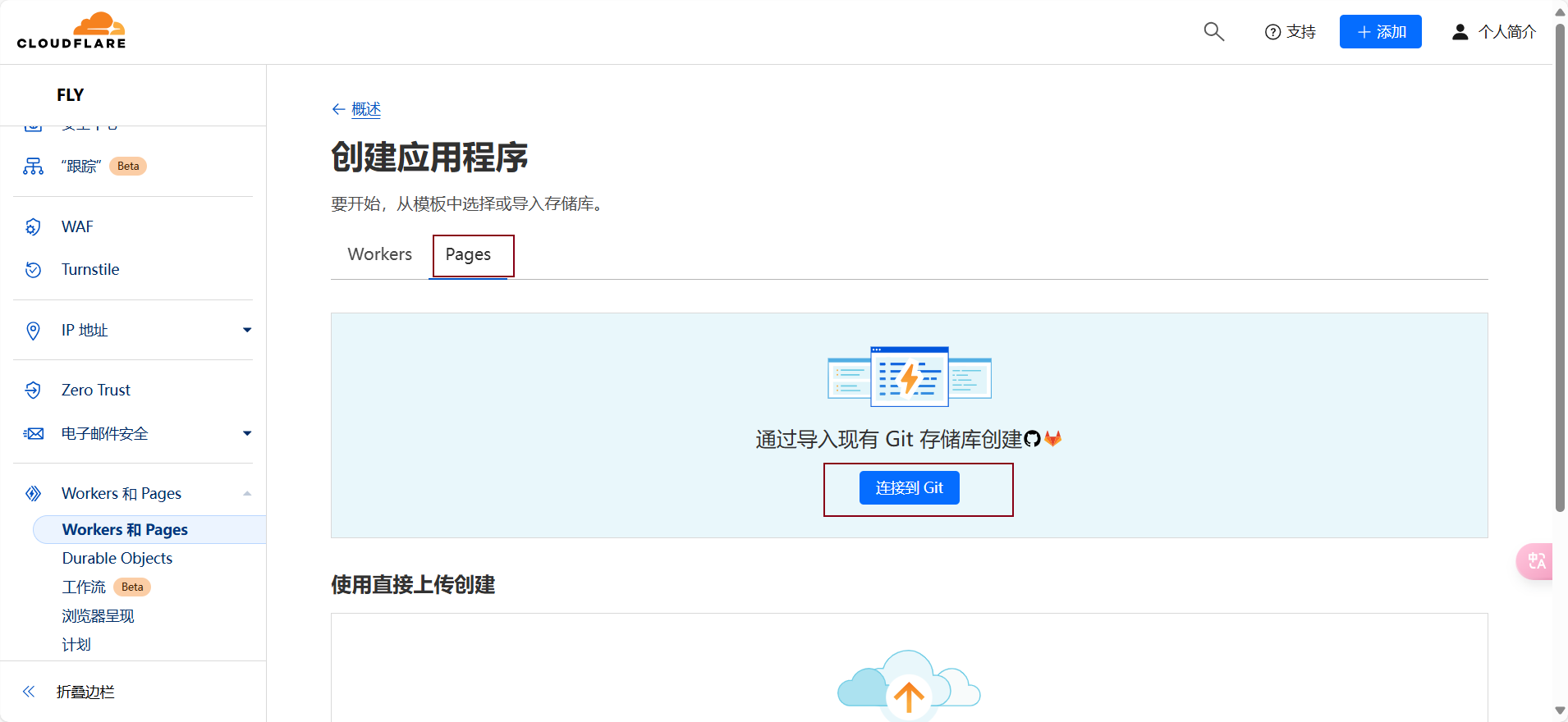 访问 Cloudflare Pages 官网,登陆 Cloudflare 账号。进入 Workers 和 Pages 界面,点击蓝色的 “ 创建” 按钮并选择建立新的 Pages。